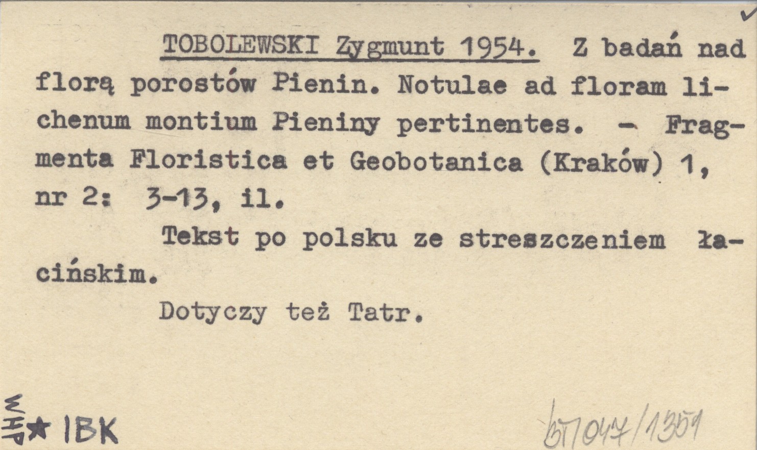 TOBOLEWSKI Zygmunt 1954 Z badań nad florą porostów Pienin. Notulae ad floriam lichenum montium Pieniny pertinentes.