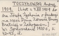 TOCZYŁOWSKI Andrzej 1909 [List z 4 XII 1909 do dra Józefa Żychonia o fundacji na rzecz Domu Zdrowia Pomocy Bratniej w Zakopanem.]