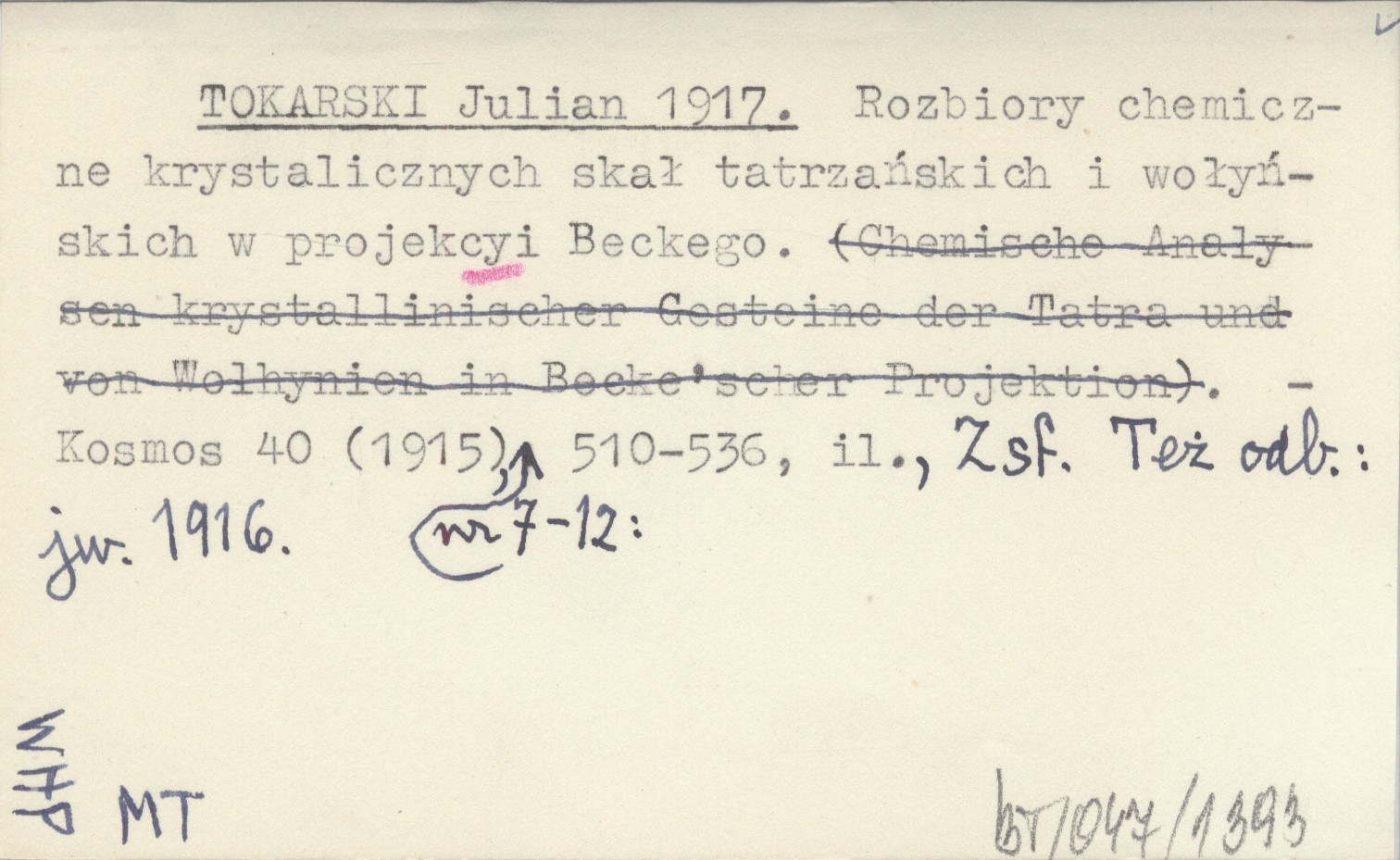 TOKARSKI Julian 1917 Rozbiory chemiczne krystalicznych skał tatrzańskich i wołyńskich w projekcyi Beckiego.