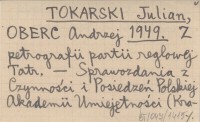 TOKARSKI Julian OBERC, Andrzej. ; 1949 Z petrografii partii reglowej Tatr.