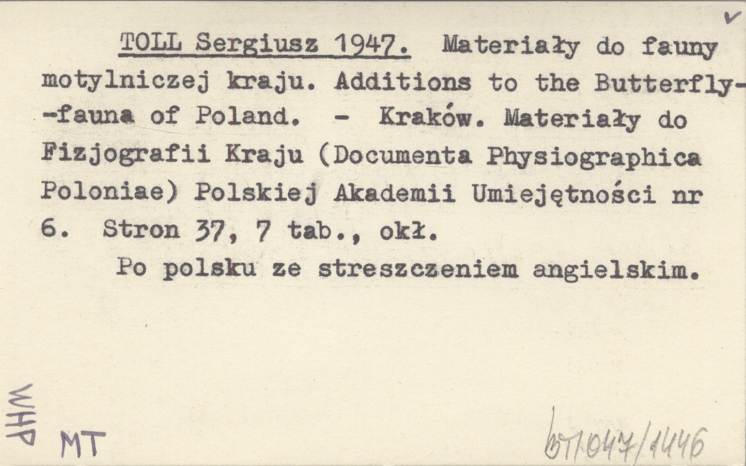 TOLL Sergiusz 1947 Materiały do fauny motylniczej kraju. Additions to the Butterfly-fauna of Poland.