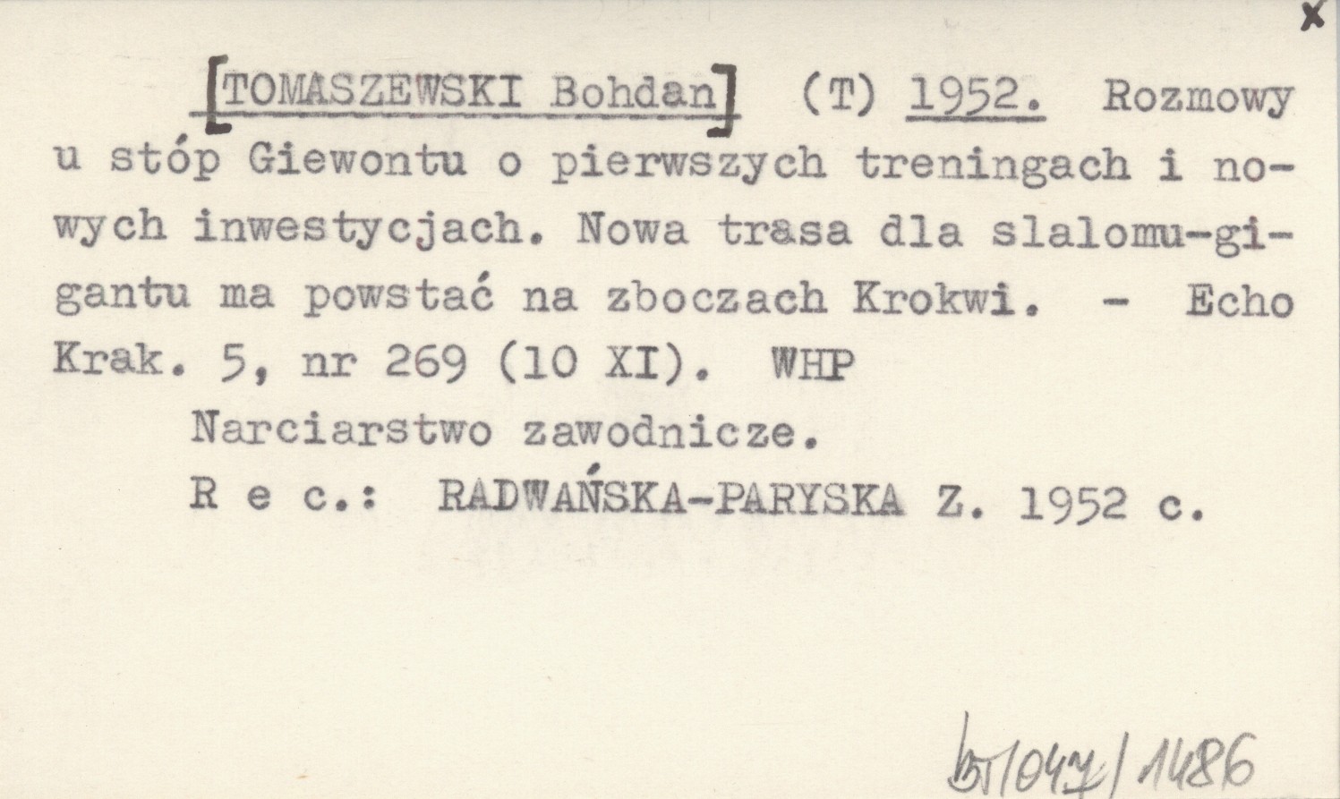 (T) [TOMASZEWSKI Bohdan] 1952 Rozmowy u stóp Giewontu o pierwszych treningach i nowych inwestycjach. Nowa trasa dla slalomu-gigantu ma powstać na zboczach Krokwi.