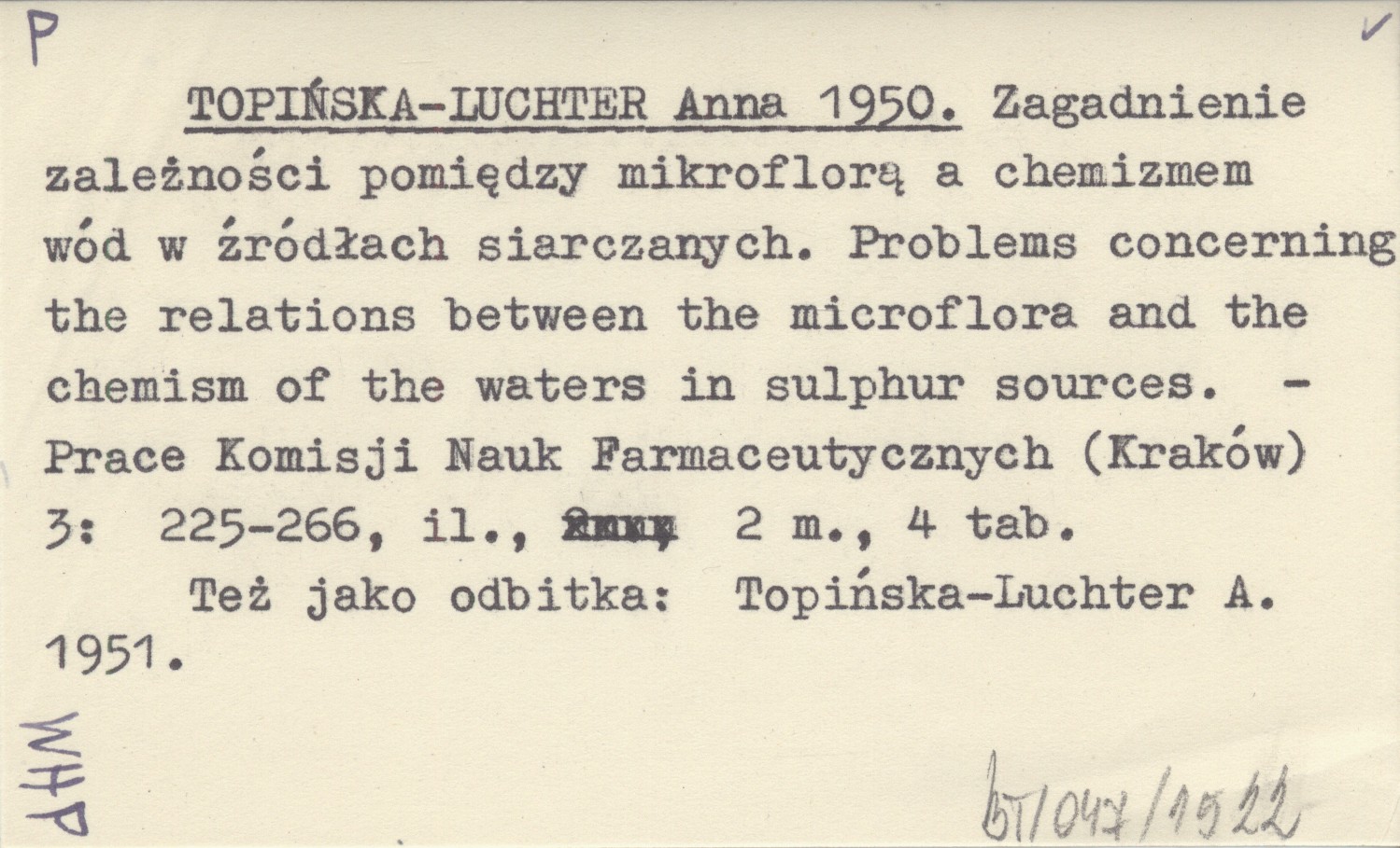 TOPIŃSKA-LUCHTER Anna 1950 Zagadnienie zależności pomiędzy mikroflorą a chemizmem wód w źródłach siarczanych. Problems concerning the relations between the microflora and the chemism of the waters in sulphur sources.