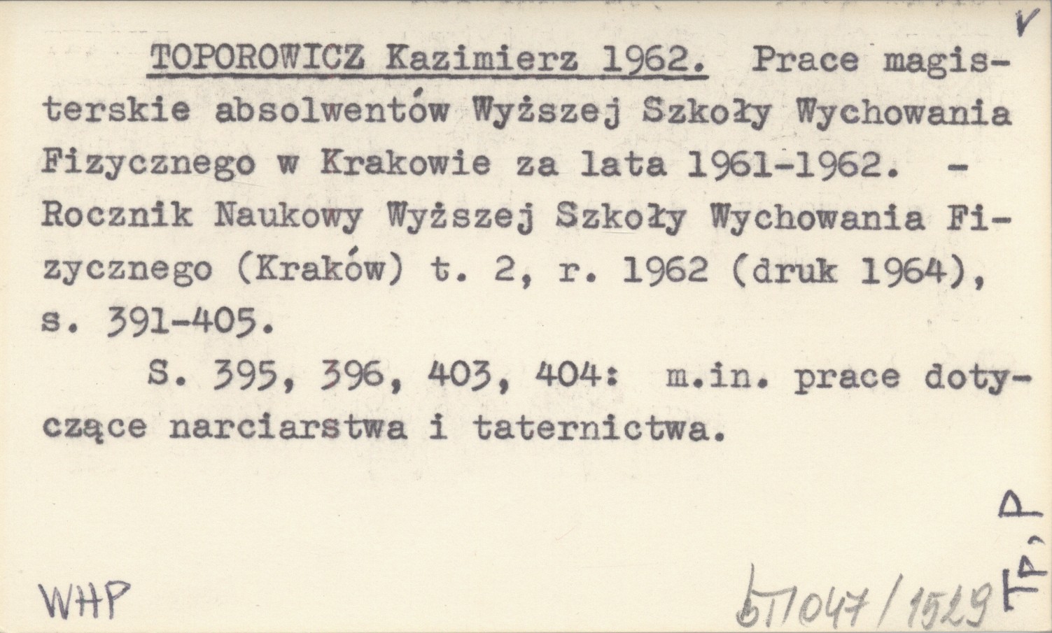 TOPOROWICZ Kazimierz 1962 Prace magisterskie absolwentów Wyższej Szkoły Wychowania Fizycznego w Krakowie za lata 1961-1962.