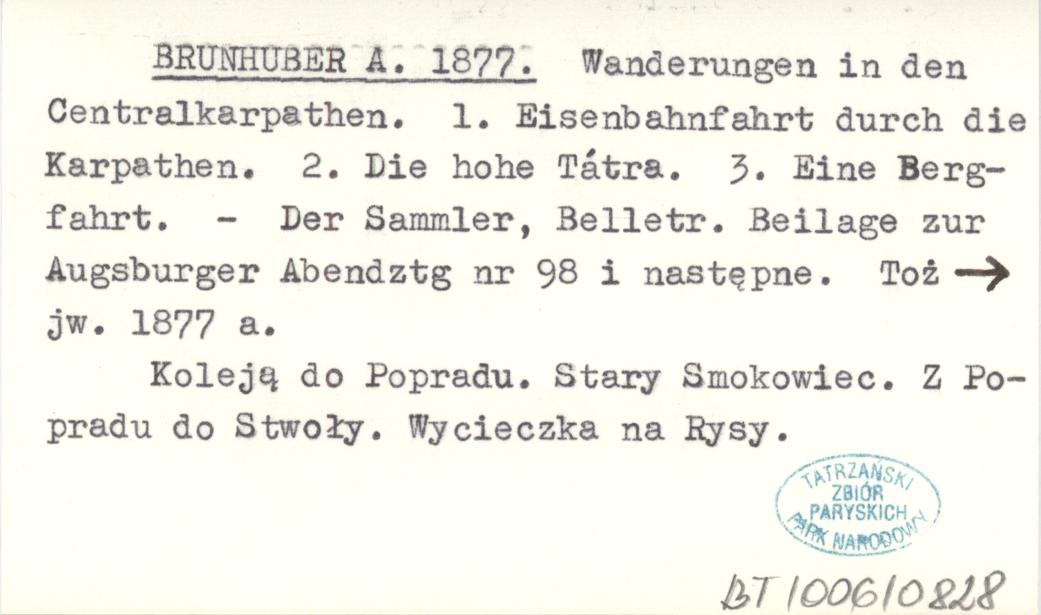 Der Sammler, Belletr. Beilage zur Augsburger Abendztg, Nr 98 i następne. Koleją do Popradu. Stary Smokowiec. Z Popradu do Stwoły. Wycieczka na Rysy. Toż jw. 1877 a