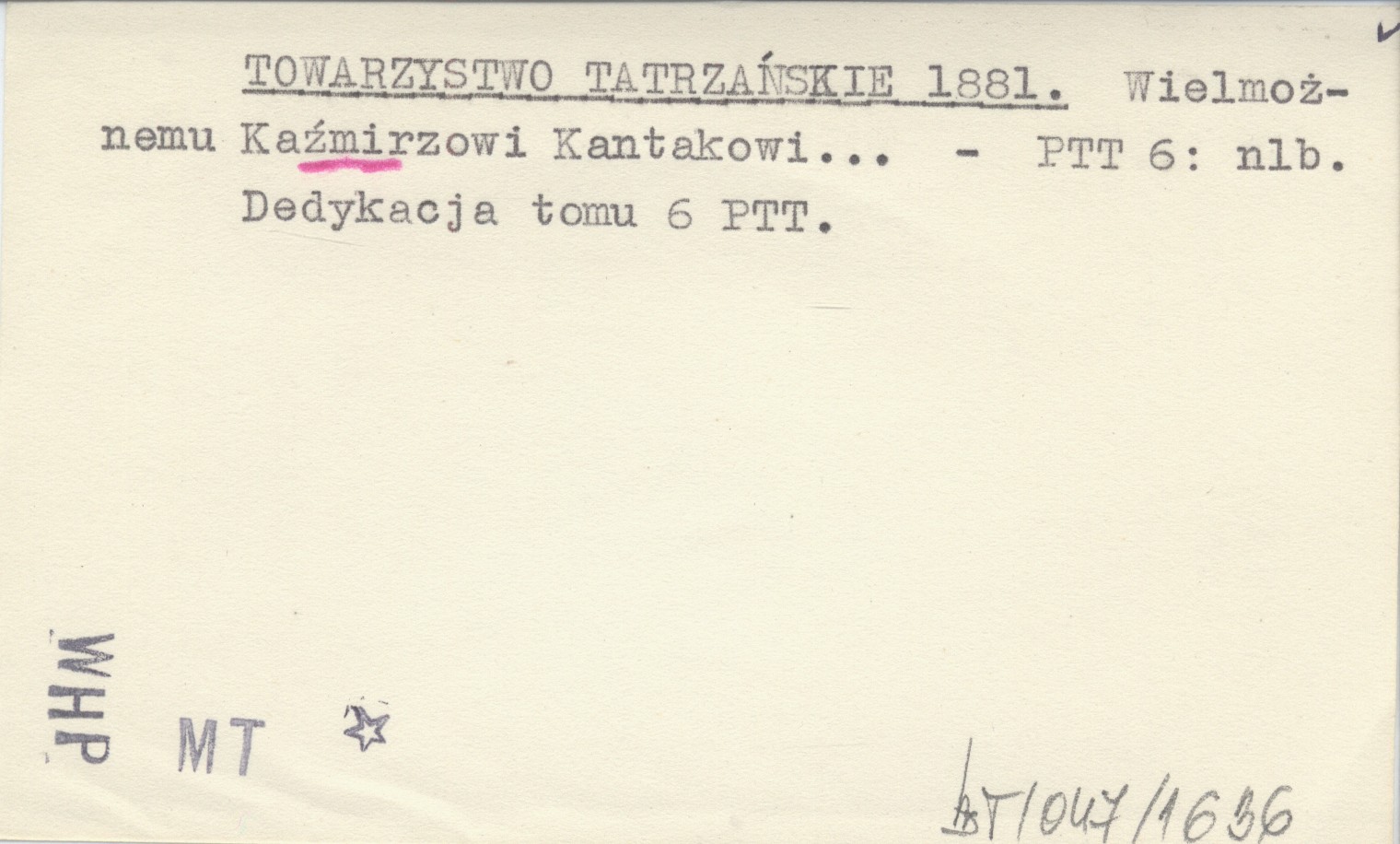 TOWARZYSTWO TATRZAŃSKIE 1881 Wielmożnemu Kaźmirzowi Kantakowi...