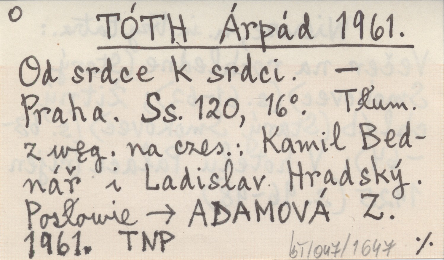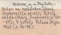 Praha , 120 s., 16°. Wiersze, m.in. trzy tatrz.: Večer na rozhledne (Starý Smokovec)(s. 61-62); Žitný chléb (Starý Smokovec)(s. 63-64); V hotelu Palace (říjen 1925 (s. 96-98). Tłum. z węg. na czes.: Kamil Bednář i Ladislav Hradský. Posłowie → ADAMOVÁ Z. 1961.