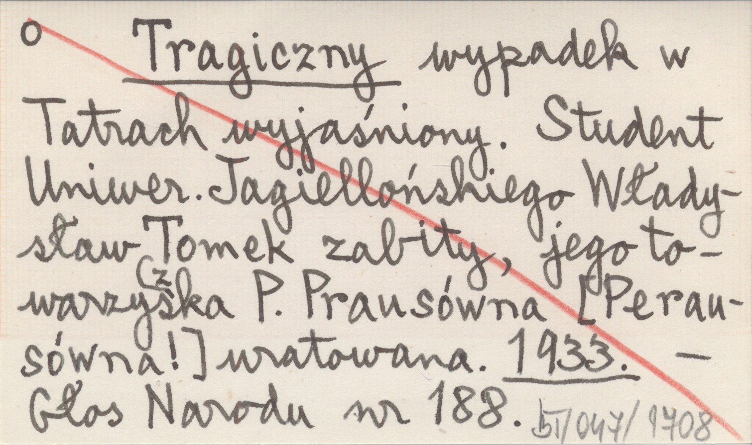 Tragiczny wypadek w Tatrach wyjaśniony. Student Uniwer. Jagiellońskiego Władysław Tomek zabity, jego towarzyszka P. Prausówna [Perausówna!] uratowana. 1933