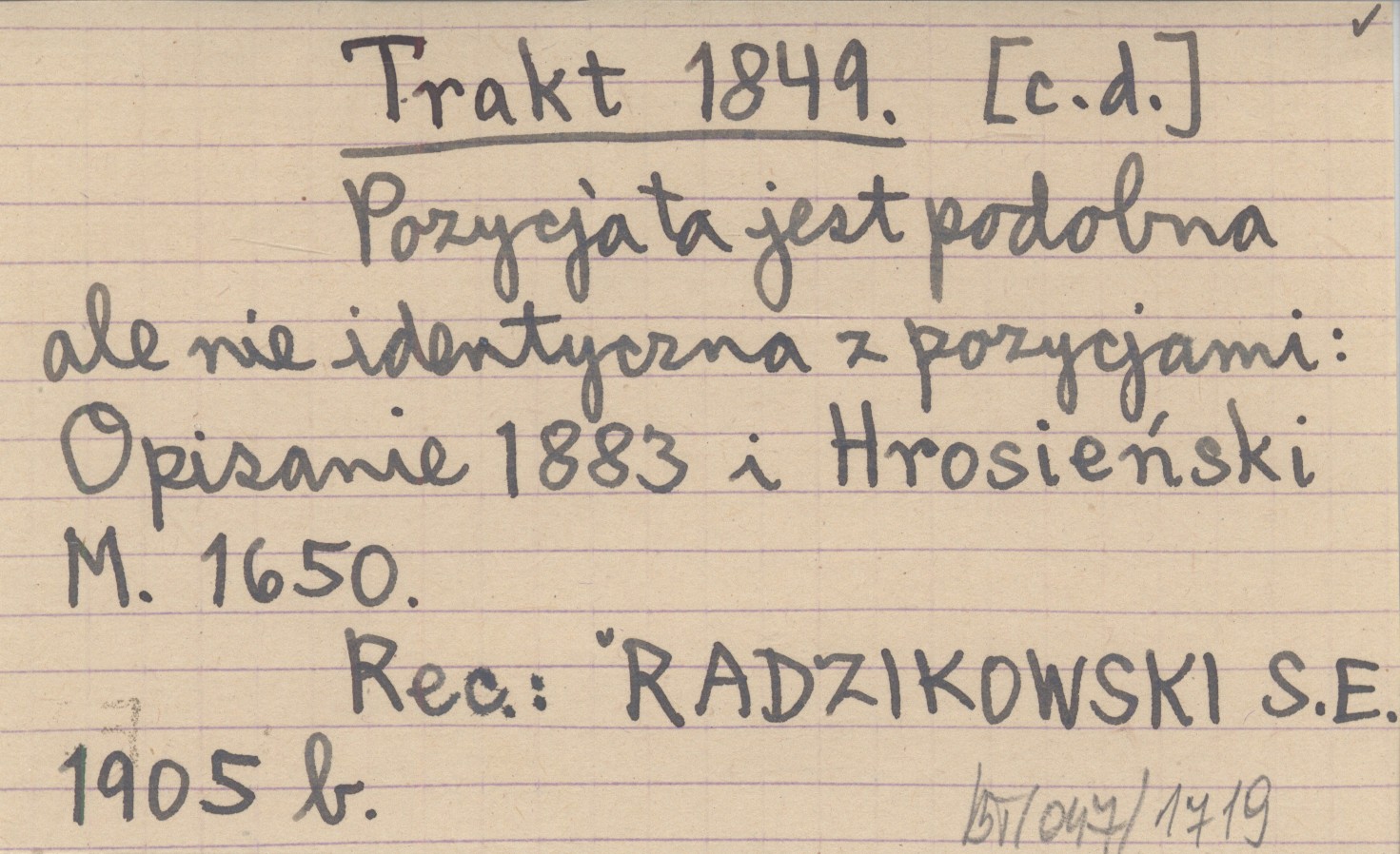 Biblioteka Warszawska (Warszawa) , T. 1 (33): 550-556. w pracy: ZEJSZNER L. 1849 b. Jest to skrócony i nieco zmieniony odpis "spisku" (przewodnika) do skarbów (z XVII w. ?). Oryginał był w zbiorze rękopisów w księdze nr 308 (karta 112 i nast.) w Zakładzie Narodowym im. Ossolińskich we Lwowie. Pozycja ta jest podobna ale nie identyczna z pozycjami: Opisanie 1883 i Hrosieński M. 1650. REC: RADZIKOWSKI S.E. 1905 b