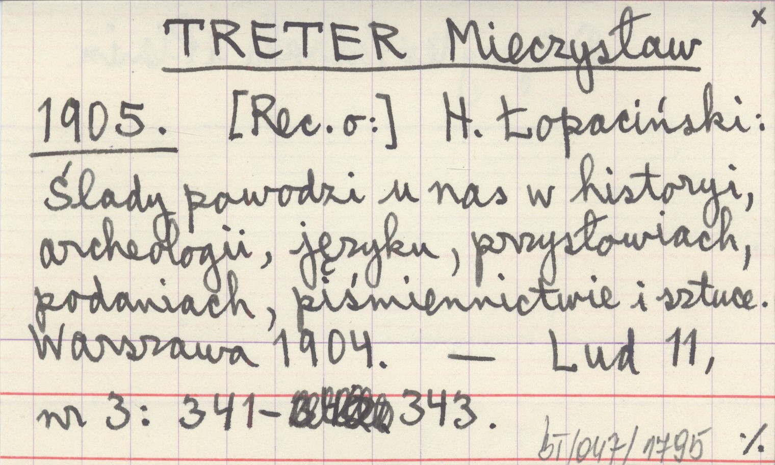 TRETER Mieczysław 1905 H. Łopaciński: Ślady powodzi u nas w historyi, archeologii, języku, przysłowiach, podaniach, piśmiennictwie i sztuce. Warszawa 1904.