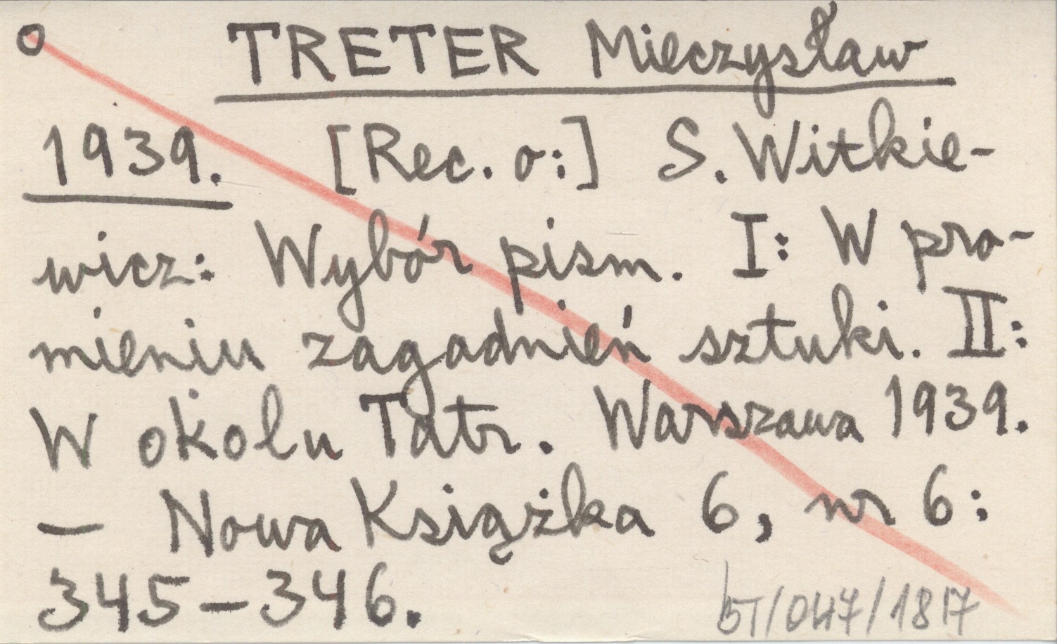 TRETER Mieczysław 1939 S. Witkiewicz: Wybór pism. I: W promieniu zagadnień sztuki. II: W okolu Tatr. Warszawa 1939.