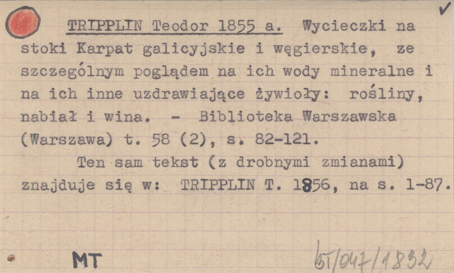 TRIPPLIN Teodor 1855 a Wycieczki na stoki Karpat galicyjskie i węgierskie, ze szczególnym poglądem na ich wody mineralne i na ich inne uzdrawiające żywioły: rośliny, nabiał i wina.