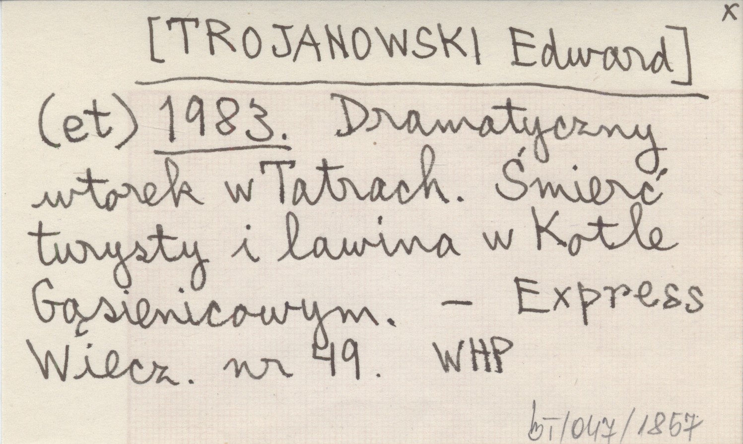 (et) [TROJANOWSKI Edward] 1983 Dramatyczny wtorek w Tatrach. Śmierć turysty i lawina w Kotle Gąsienicowym.