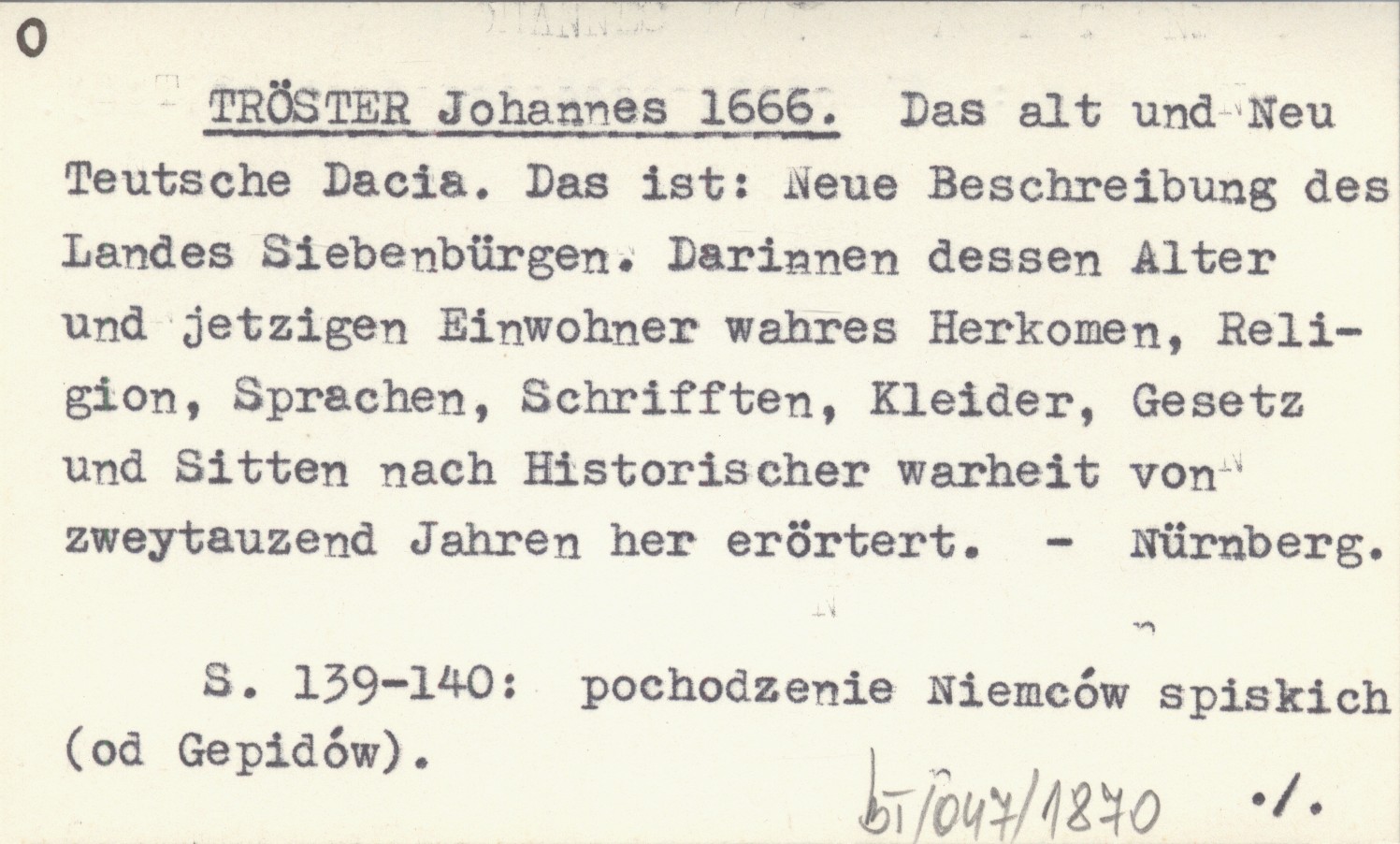 TRÖSTER Johannes 1666 Das alt und Neu Teutsche Dacia. Das ist: Neue Beschreibung des Landes Siebenbürgen. Darinnen dessen Alter und jetzigen Einwohner wahres Herkomen, Religion, Sprachen, Schrifften, Kleider, Gesetz und Sitten nach Historischer warheit von zweytauzend Jahren her erörtert.
