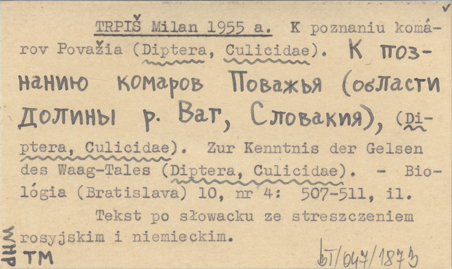 TRPIŠ Milan 1955 a K poznaniu komárov Považia (Diptera, Culicidae). K poznaniju komarov Považ'ja (oblasti doliny r. Vag, Slovakija). Zur Kenntnis der Gelsen des Waag-Tales (Diptera, Culicidae).