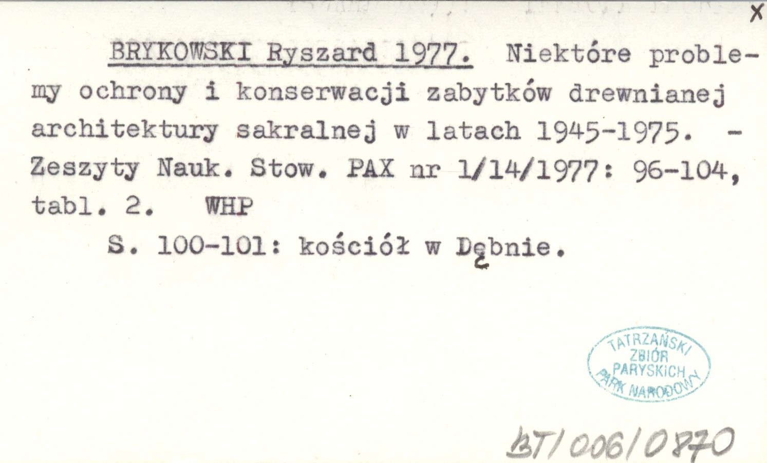 BRYKOWSKI Ryszard 1977 Niektóre problemy ochrony i konserwacji zabytków drewnianej architektury sakralnej w latach 1945-1975.