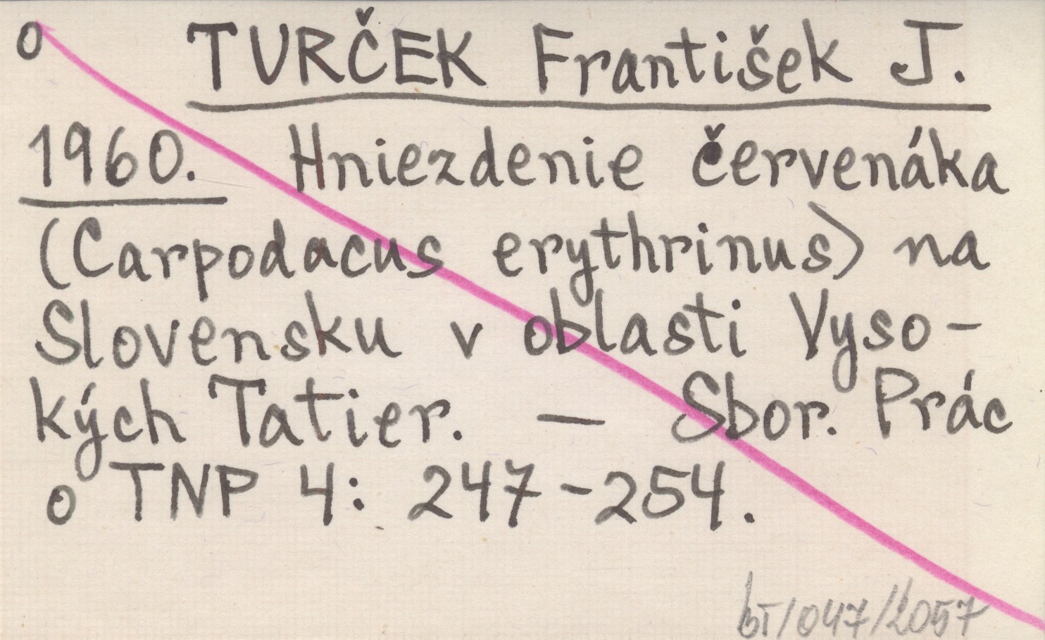 TURČEK František J. 1960 Hniezdenie červenáka (Carpodacus erythrinus) na Slovensku v oblasti Vysokých Tatier.