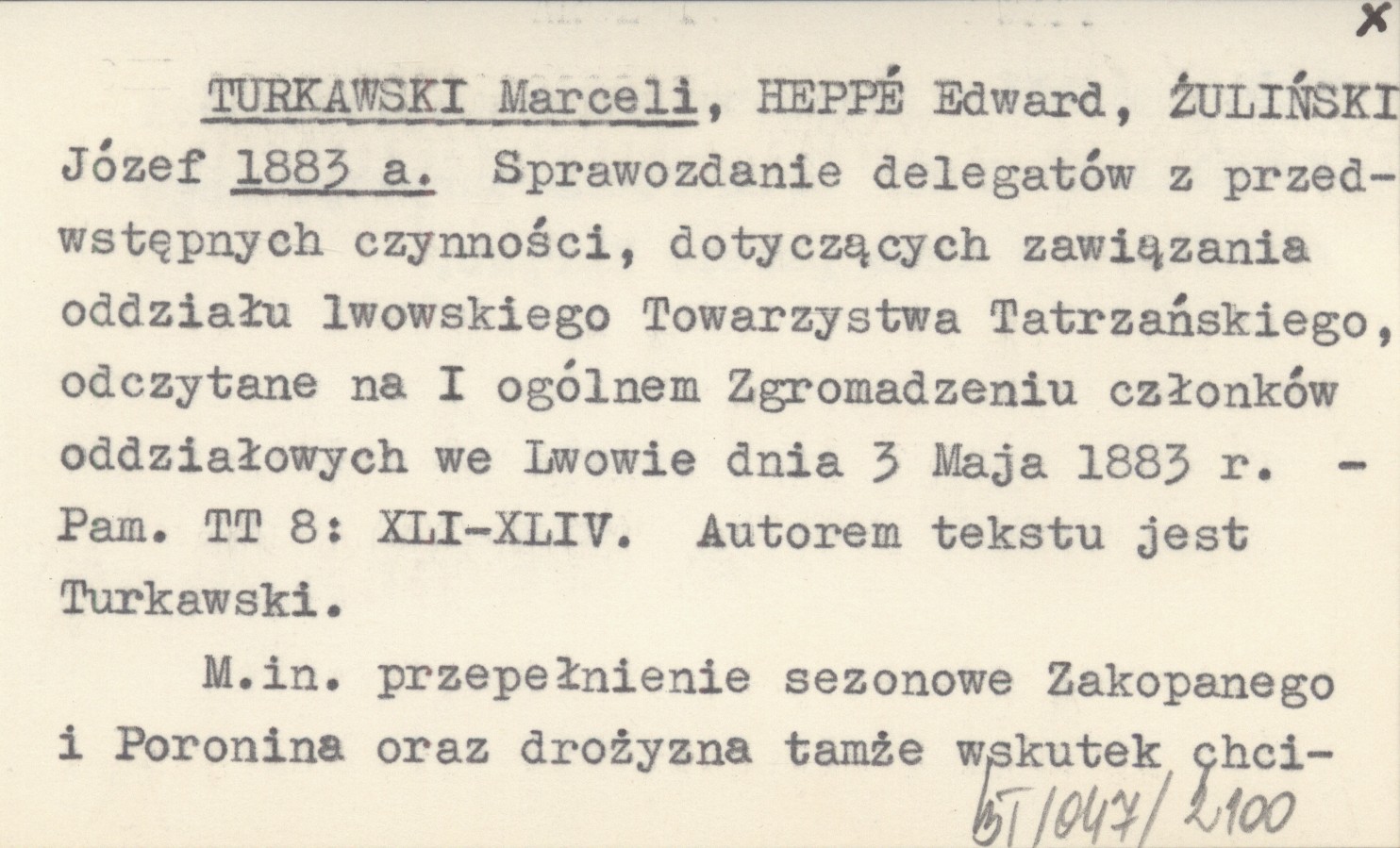 TURKAWSKI Marceli HEPPÉ, Edward. ; ŻULIŃSKI, Józef. ; 1883 a Sprawozdanie delegatów z przedwstępnych czynności, dotyczących zawiązania oddziału lwowskiego Towarzystwa Tatrzańskiego, odczytane na I ogólnem Zgromadzeniu członków oddziałowych we Lwowie dnia 3 Maja 1883 r.