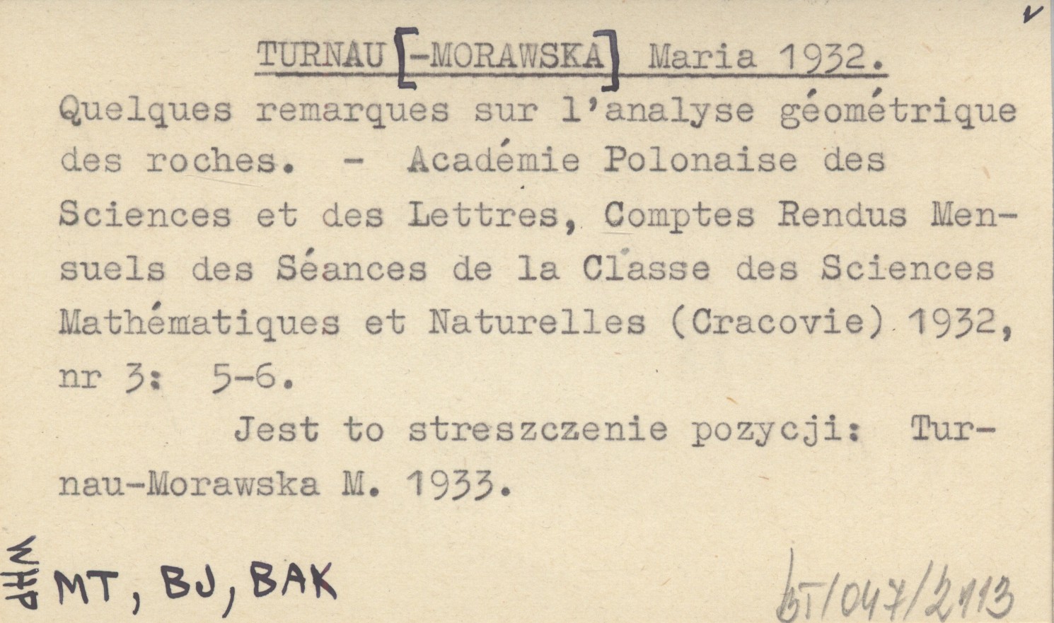 TURNAU [-MORAWSKA] Maria 1932 Quelques remarques sur l'analyse géométrique des roches.
