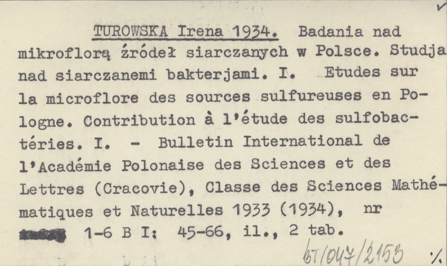 TUROWSKA Irena 1934 Badania nad mikroflorą źródeł siarczanych w Polsce. Studja nad siarczanemi bakterjami. I. Etudes sur la microflore des sources sulfureuses en Pologne. Contribution á l'étude des sulfobactéries. I.