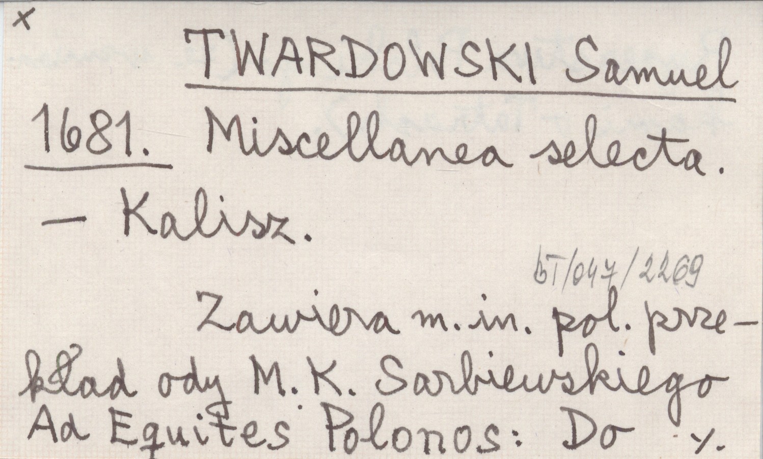 Kalisz , Zawiera m.in. pol. przekład ody M. K. Sarbiewskiego Ad Equites Polonos: Do Rycerstwa Polskiego (ze wzmiankami o Tatrach).