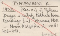 TYMIENIECKI K. 1935 J. Rafacz: Dzieje i ustrój Podhala Nowotarskiego [...]. Warszawa 1935.