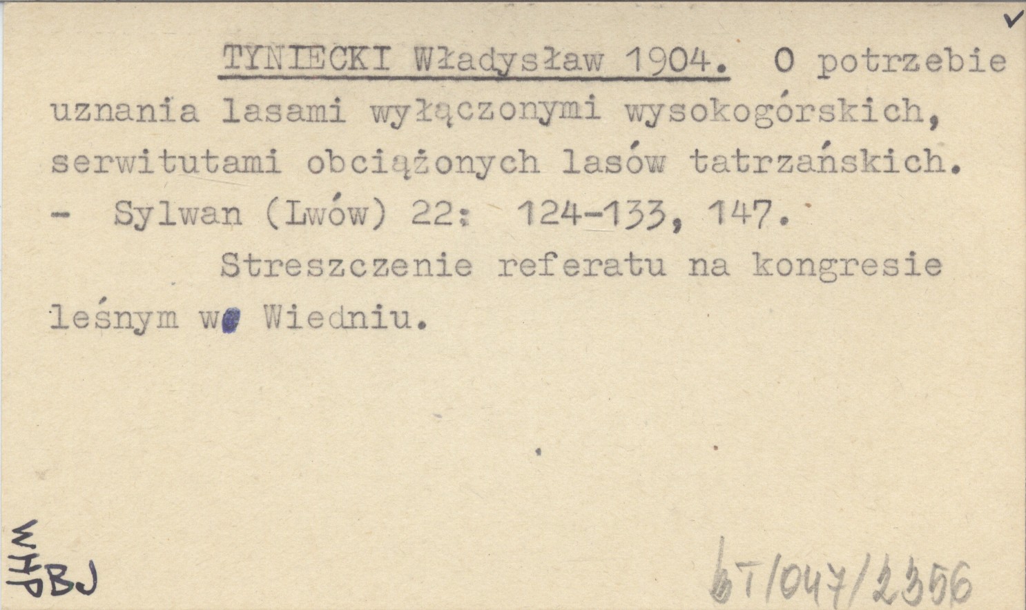 TYNIECKI Władysław 1904 O potrzebie uznania lasami wyłączonymi wysokogórskich, serwitutami obciążonych lasów tatrzańskich.