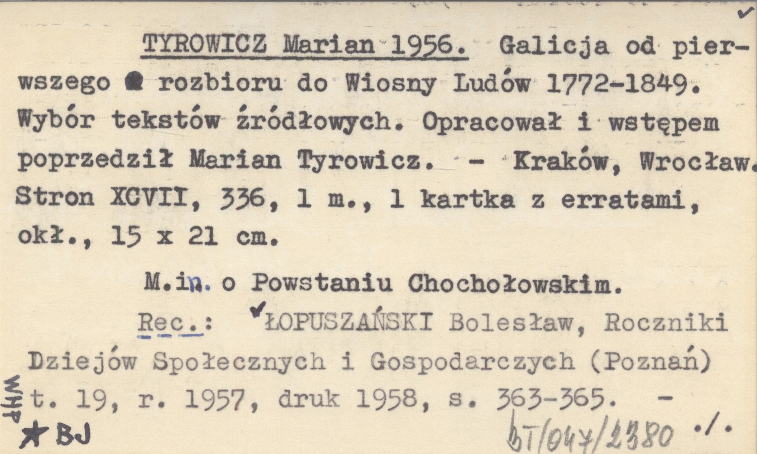 TYROWICZ Marian 1956 Galicja od pierwszego rozbioru do Wiosny Ludów 1772-1849. Wybór tekstów źródłowych. Opracował i wstępem poprzedził Marian Tyrowicz.