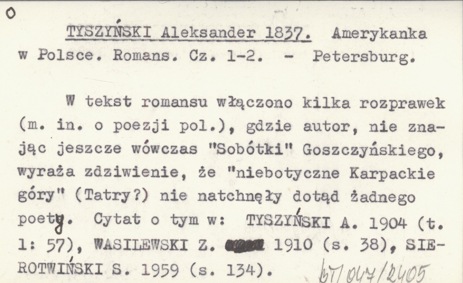 Petersburg , W tekst romansu włączono kilka rozprawek (m.in. o poezji pol.), gdzie autor, nie znając jeszcze wówczas "Sobótki" Goszczyńskiego, wyraża zdziwienie, że "niebotyczne Karpackie góry" (Tatry?) nie natchnęły dotąd żadnego poety. Cytat o tym w: TYSZYŃSKI A. 1904 (t. 1: 57), WASILEWSKI Z. 1910 (s. 38), SIEROTWIŃSKI S. 1959 (s. 134).