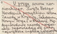 U progu sezonu narciarskiego. Święta Bożego Narodzenia początkiem sezonu. Zawody w Krynicy, Zakopanem, Nowym Targu i w Krakowie. Międzynarodowe zawody narciarskie zapowiadają się jako największa impreza narciarska świata. 1928