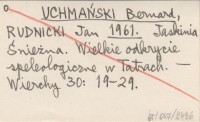 UCHMAŃSKI Bernard RUDNICKI, Jan. ; 1961 Jaskinia Śnieżna. Wielkie odkrycie speleologiczne w Tatrach.