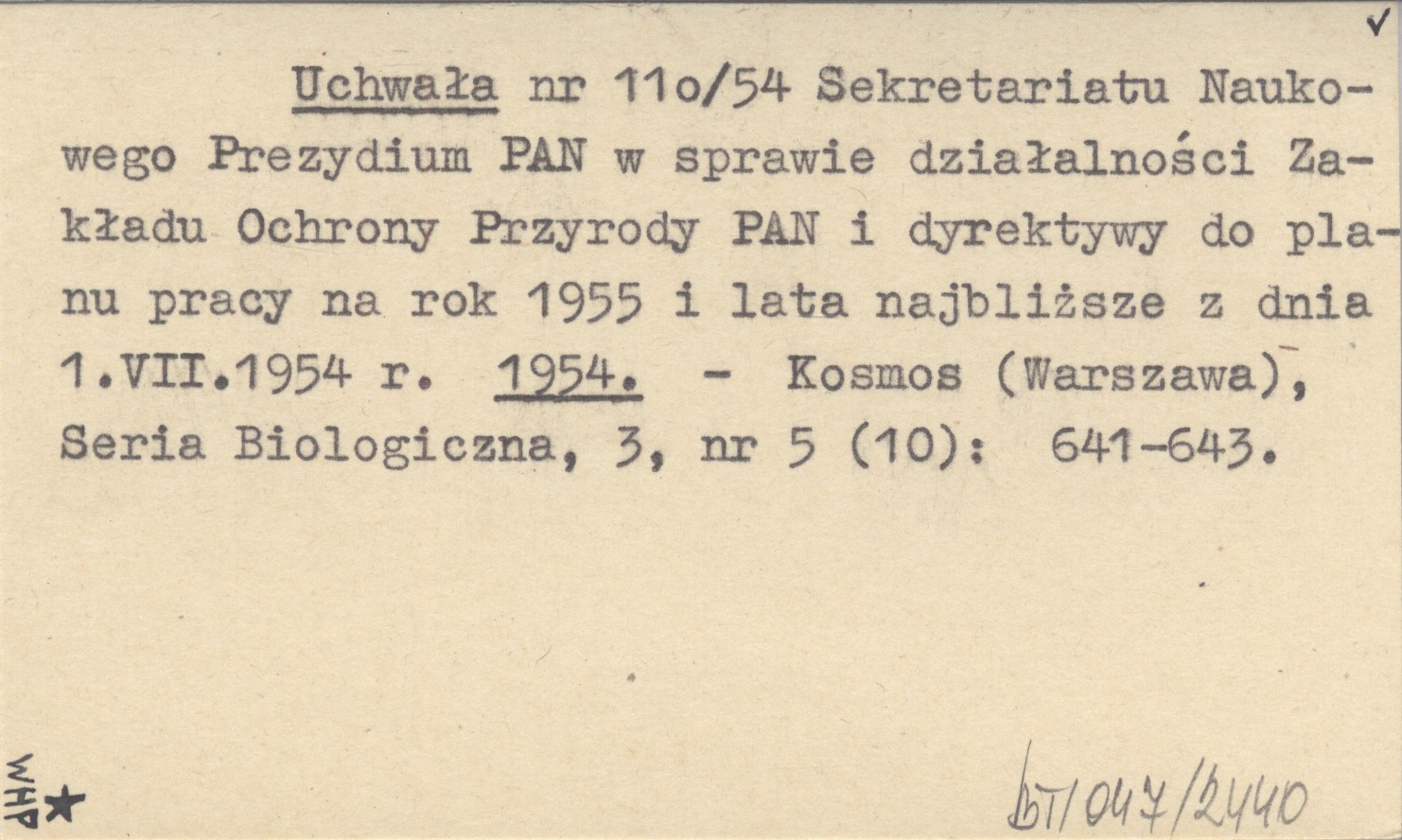 Uchwała nr 110/54 Sekretariatu Naukowego Prezydium PAN w sprawie działalności Zakładu Ochrony Przyrody PAN i dyrektywy do planu pracy na rok 1955 i lata najbliższe z dnia 1.VII.1954 r. 1954