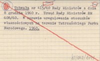 Uchwała nr 415/60 Rady Ministrów z dnia 8 grudnia 1960 r. Urząd Rady Ministrów RM 608/60. W sprawie uregulowania stosunków własnościowych na terenie Tatrzańskiego Parku Narodowego. 1960
