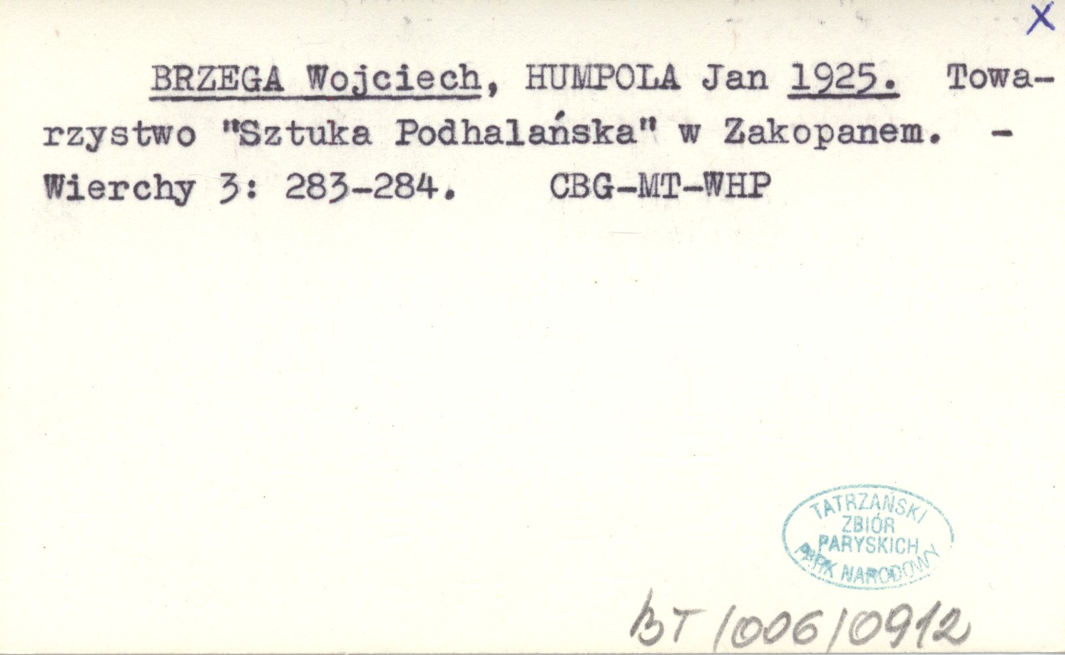 BRZEGA Wojciech HUMPOLA, Jan. ; 1925 Towarzystwo "Sztuka Podhalańska" w Zakopanem.