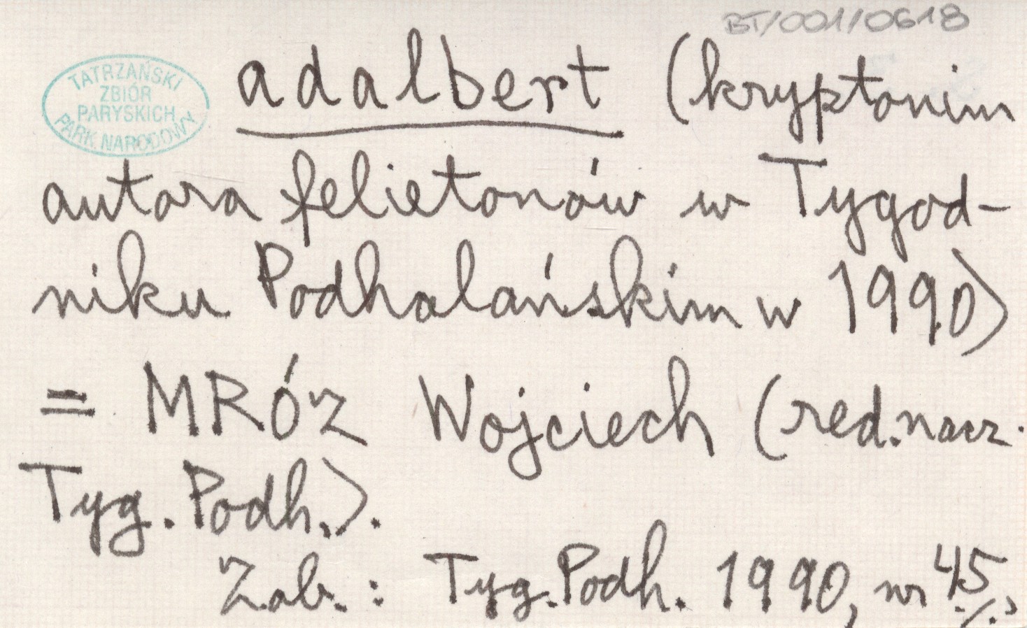 adalbert MRÓZ Wojciech Tygodnik Podhalański 1990, nr 45, 3. Kryptonim autora felietonów w Tygodniku Podhalańskim w 1990. Red. nacz. Tygodnika Podhalańskiego.