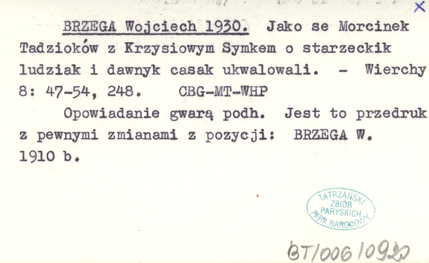 Wierchy, 8: 47-54, 248. Opowiadanie gwarą podh. Jest to przedruk z pewnymi zmianami z pozycji: BRZEGA W. 1910 b