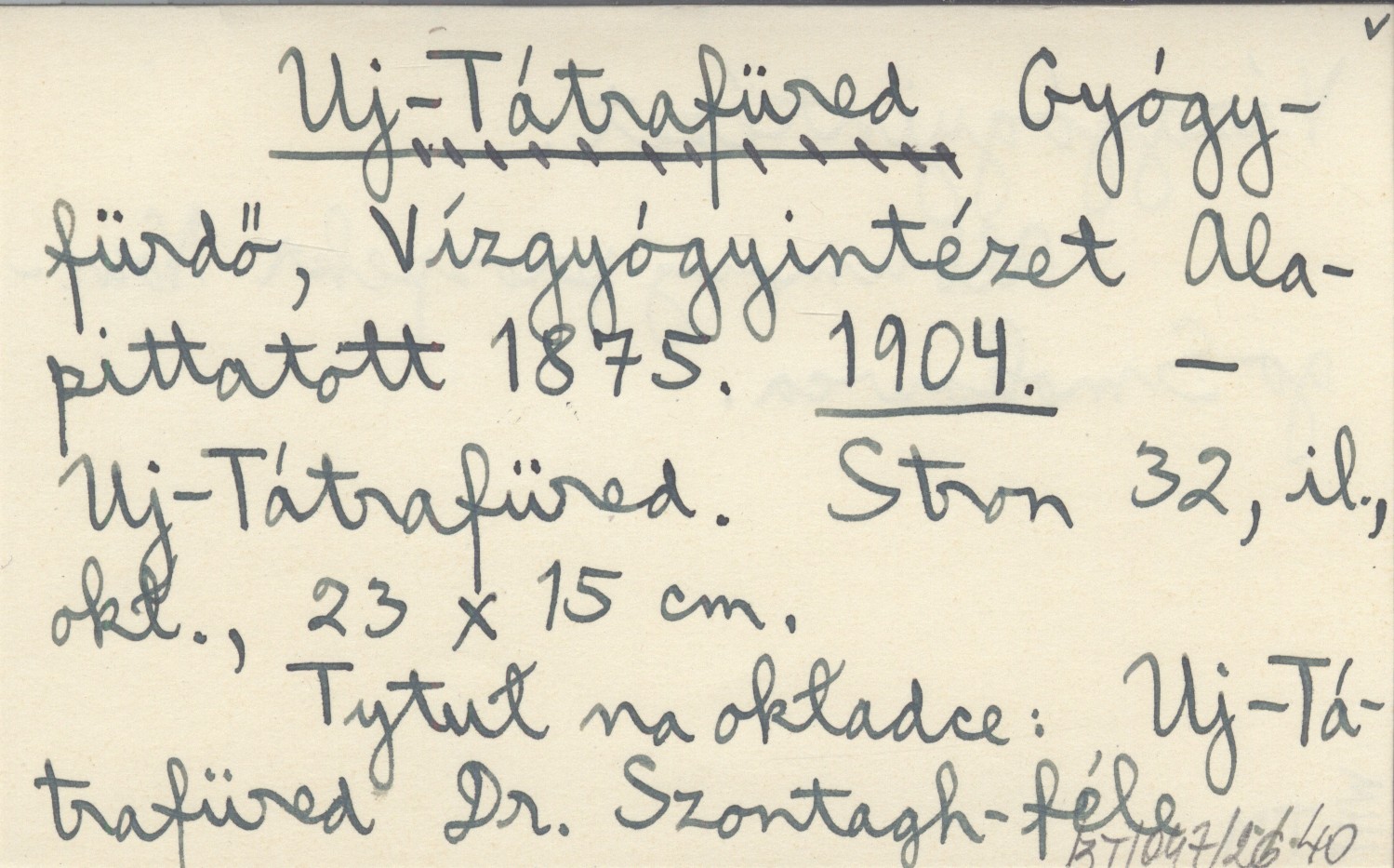 Uj-Tátrafüred , 32 s., il., okł., 23x15 cm. Albumowy prospekt Nowego Smokowca. Tytuł na okładce: Uj-Tátrafüred Dr. Szontagh-féle Vízgyógyintézet.