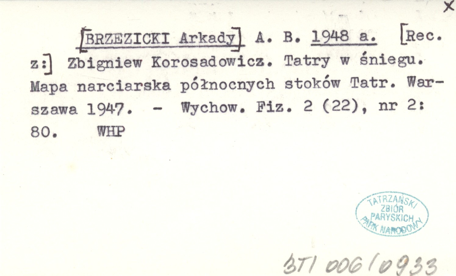 A. B. [BRZEZICKI Arkady] 1948 a [Rec. o:] Zbigniew Korosadowicz. Tatry w śniegu. Mapa narciarska północnych stoków Tatr. Warszawa 1947.