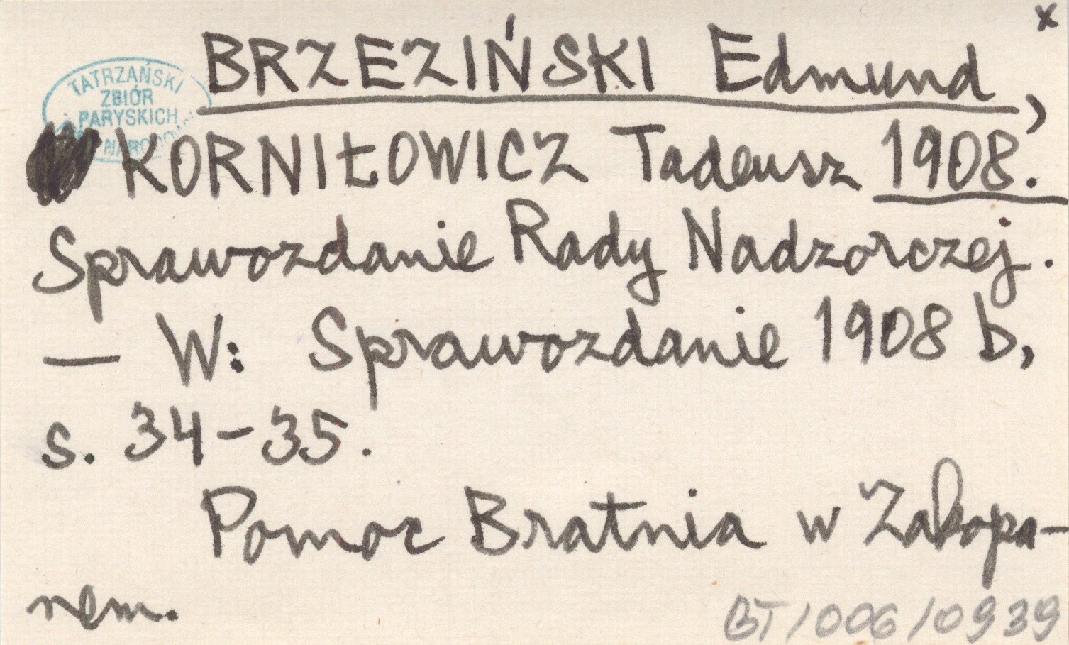 BRZEZIŃSKI Edmund KORNIŁOWICZ, Tadeusz. ; 1908 Sprawozdanie Rady Nadzorczej.