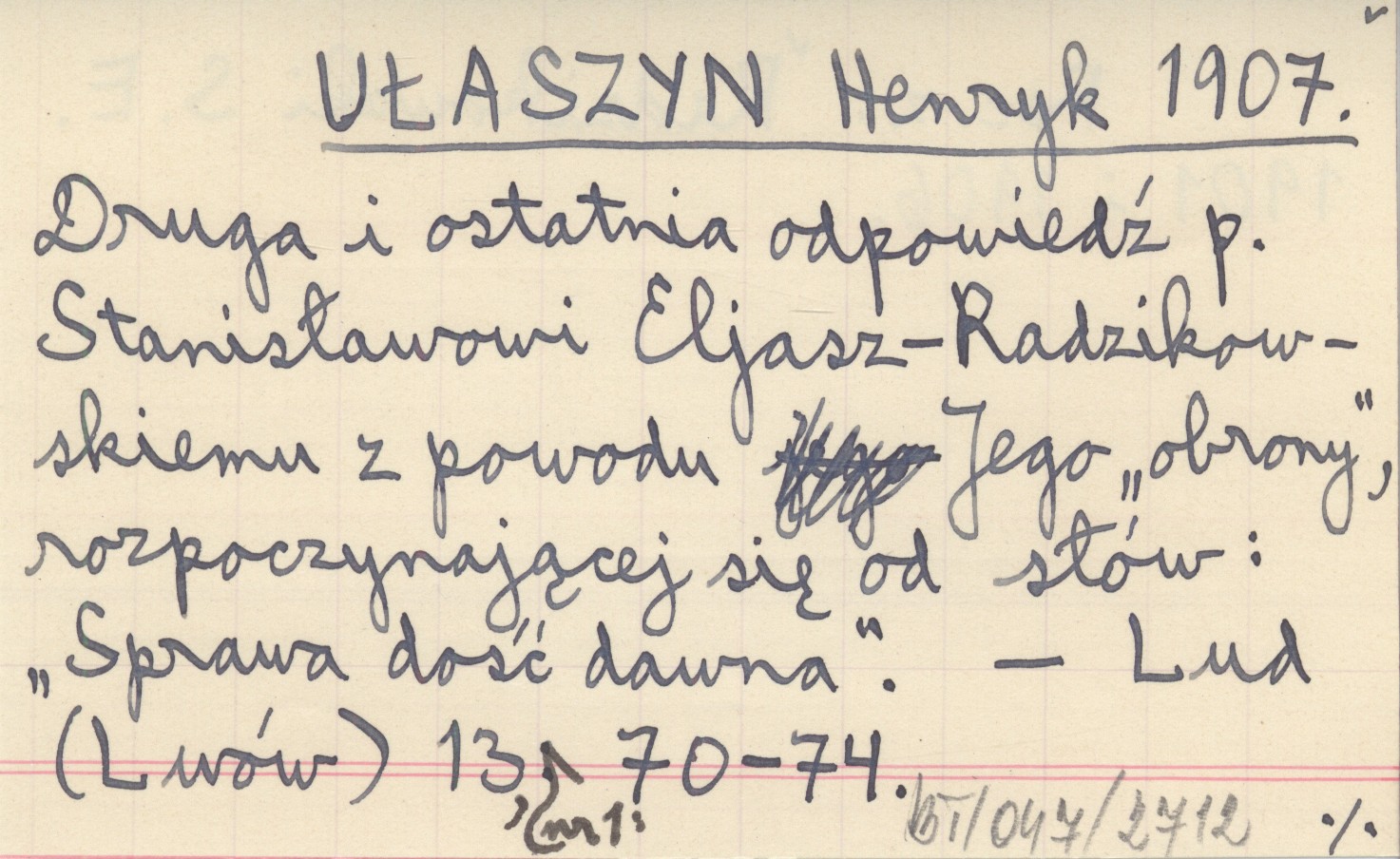 UŁASZYN Henryk 1907 Druga i ostatnia odpowiedź p. Stanisławowi Eljasz-Radzikowskiemu z powodu Jego "obrony", rozpoczynającej się od słów: "Sprawa dość dawna".