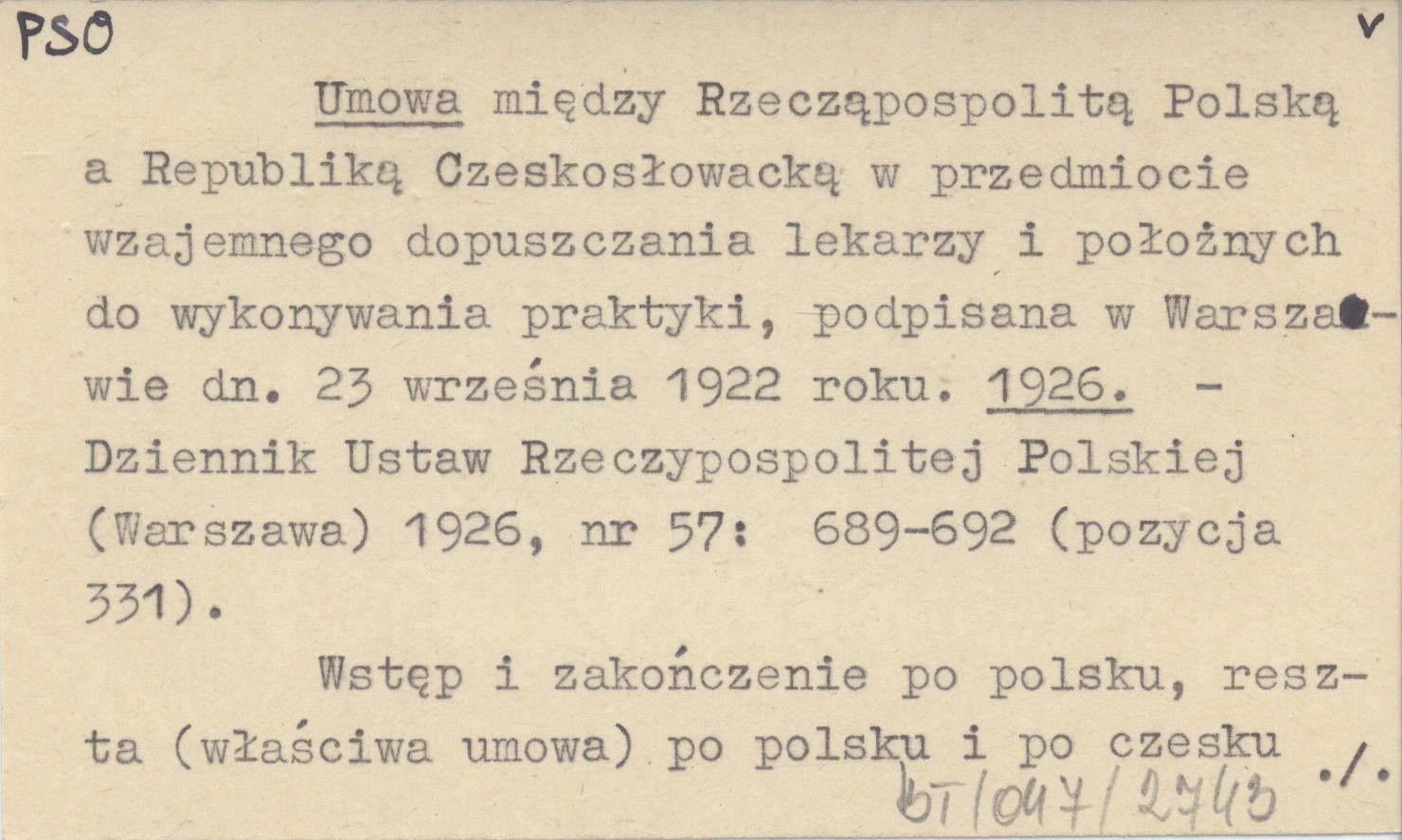 Umowa między Rzecząpospolitą Polską a Republiką Czeskosłowacką w przedmiocie wzajemnego dopuszczania lekarzy i położnych do wykonywania praktyki, podpisana w Warszawie dn. 23 września 1922 roku. 1926
