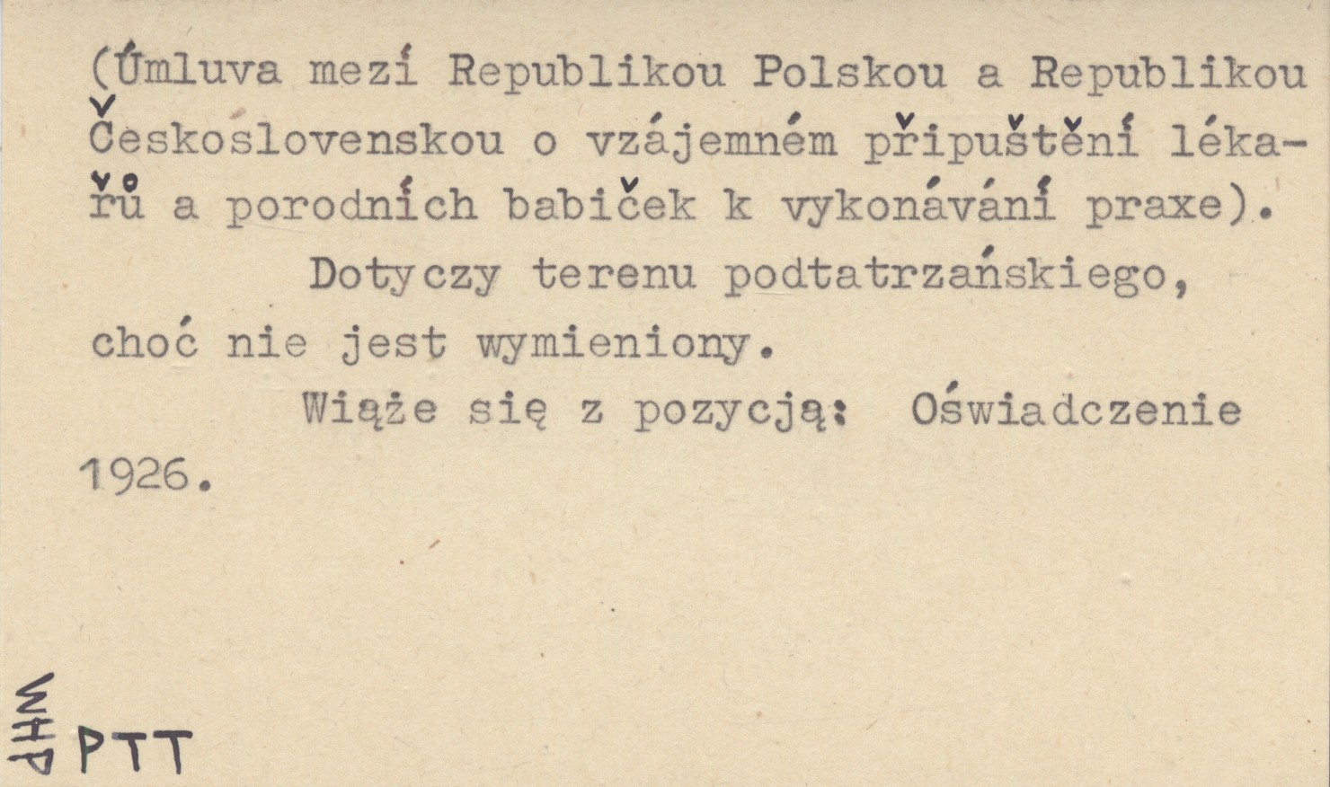 Dziennik Ustaw Rzeczypospolitej Polskiej (Warszawa) , Nr 57: 689-692 (poz. 331). Dotyczy terenu podtatrzańskiego, choć nie jest wymieniony. Wstęp i zakończenie po polsku, reszta (właściwa umowa) po polsku i po czesku (Úmluva mezí Republikou Polskou a Republikou Československou o vzájemném připuštění lékařů a porodních babiček k vykonávání praxe). Wiąże się z pozycją: Oświadczenie 1926.