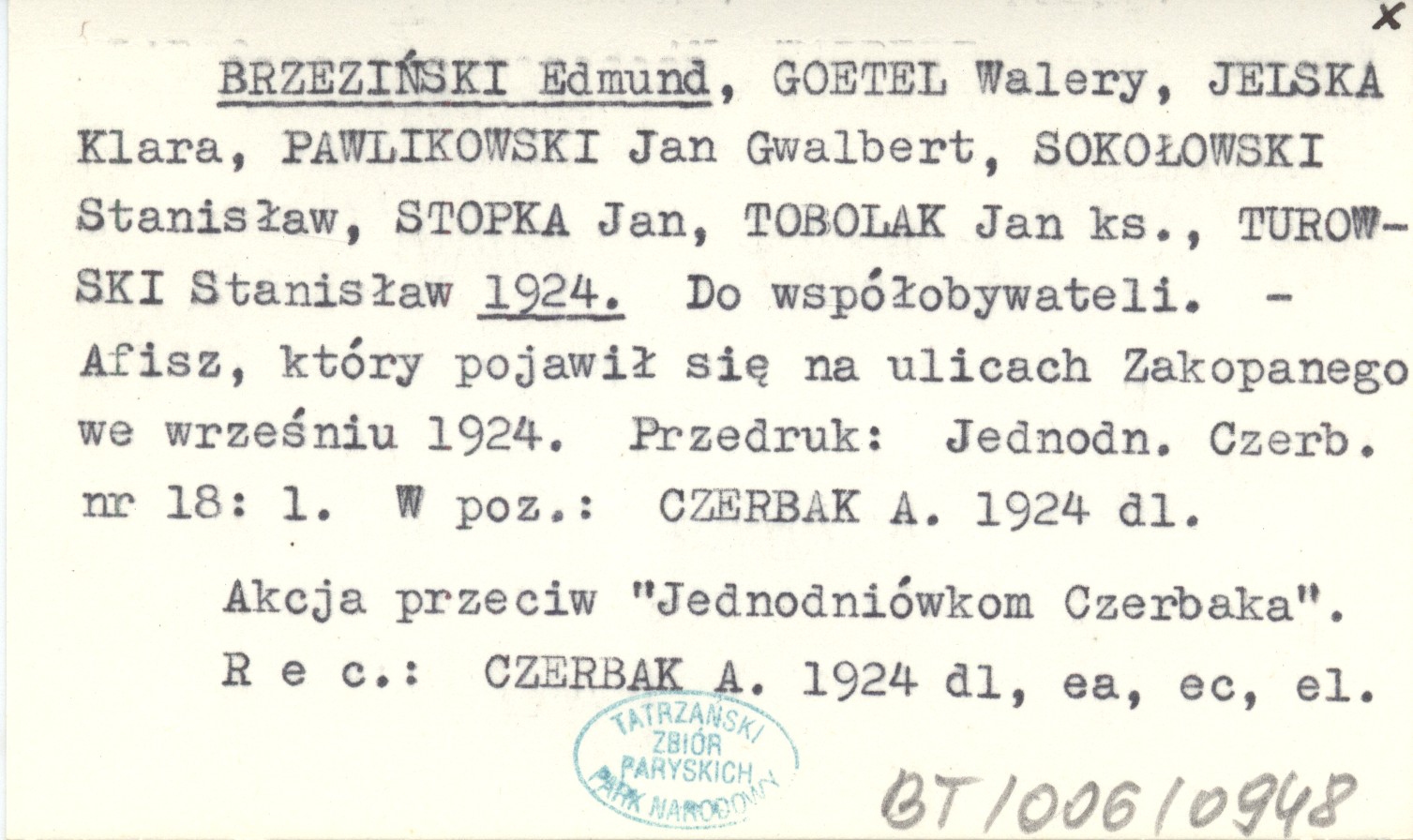 , Afisz, który pojawił się na ulicach Zakopanego we wrześniu 1924. Akcja przeciw "Jednodniówkom Czerbaka". Przedruk: Jednodniówka Czerbaka nr 18: 1. W poz.: CZERBAK A. 1924 dl REC: CZERBAK A. 1924 dl, ea, ec, el.
