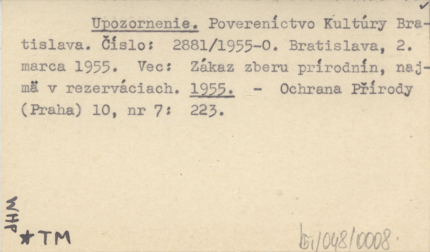 Upozornenie. Povereníctvo Kultúry Bratislava. Číslo: 2881/1955-0. Bratislava, 2. marca 1955. Vec: Zákaz zberu prírodnín, najmä v rezerváciach. 1955