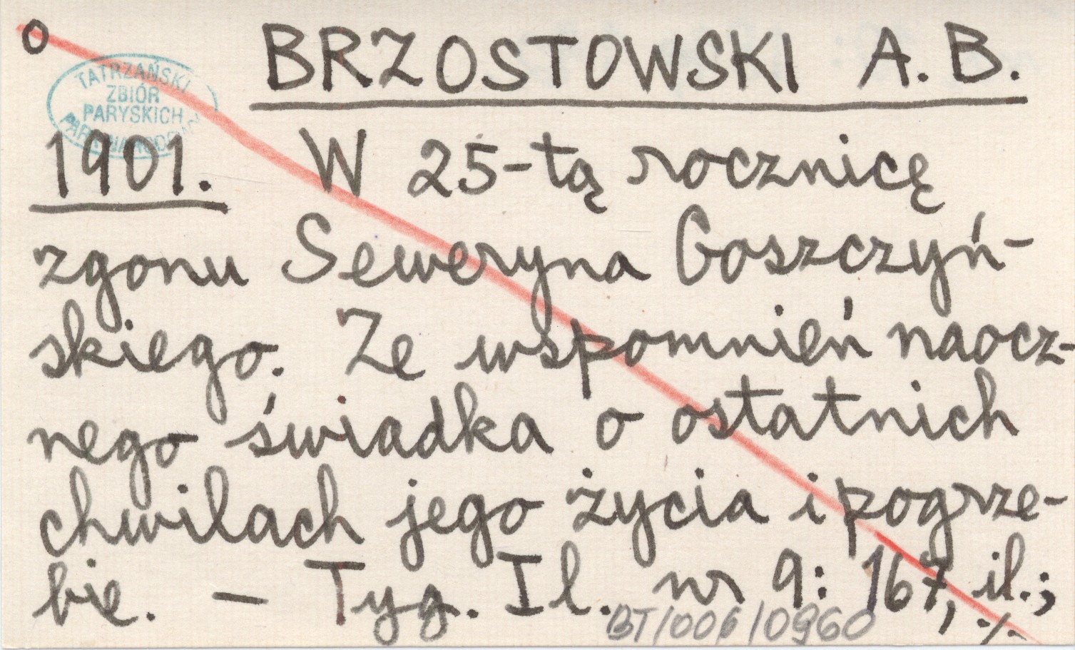 BRZOSTOWSKI A. B. 1901 W 25-tą rocznicę, zgonu Seweryna Goszczyńskiego. Ze wspomnień naocznego świadka o ostatnich chwilach jego życia i pogrzebie.