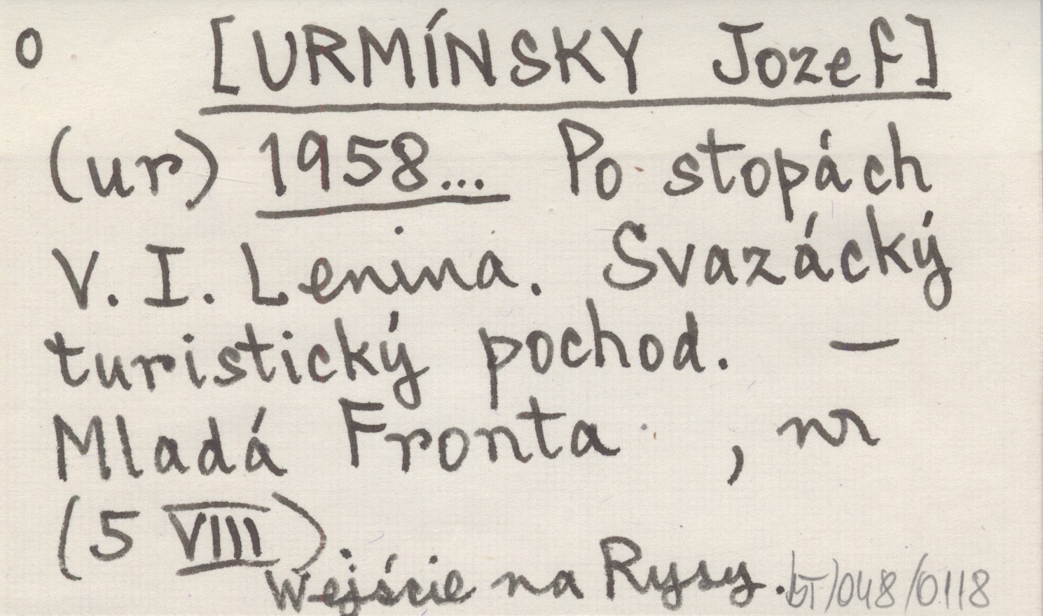 (ur) [URMÍNSKY Jozef] 1958... Po stopách V. I. Lenina. Svazácký turistický pochod.