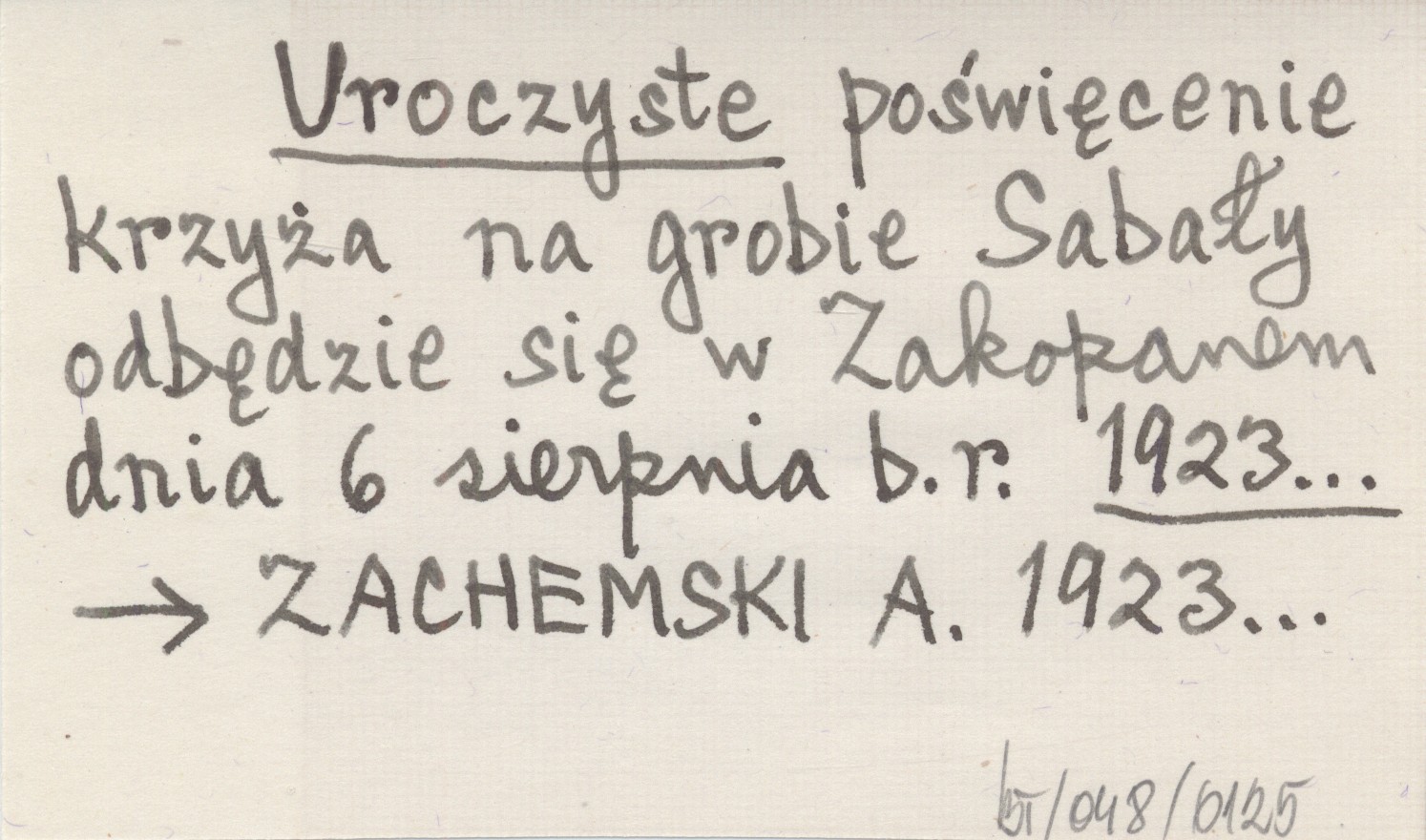 Uroczyste poświęcenie krzyża na grobie Sabały odbędzie się w Zakopanem dnia 6 sierpnia b. r. 1923...