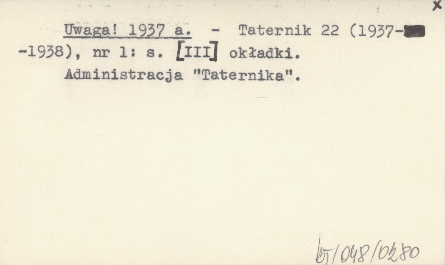 Taternik, 22 (1937-1938), nr 1: [III] (okł.). Administracja "Taternika".