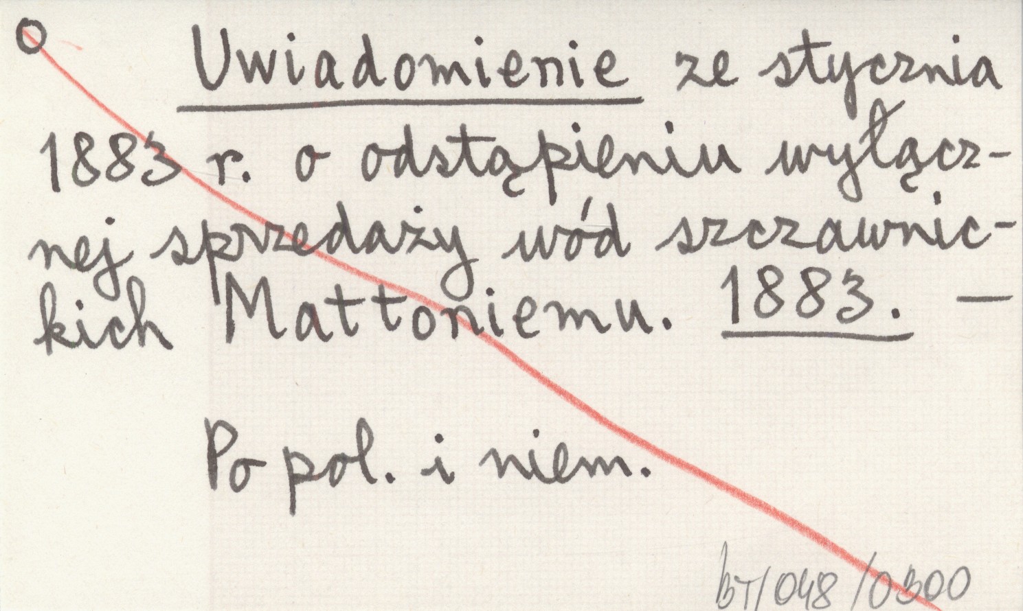Uwiadomienie ze stycznia 1883 r. o odstąpieniu wyłącznej sprzedaży wód szczawnickich Mattoniemu. 1883