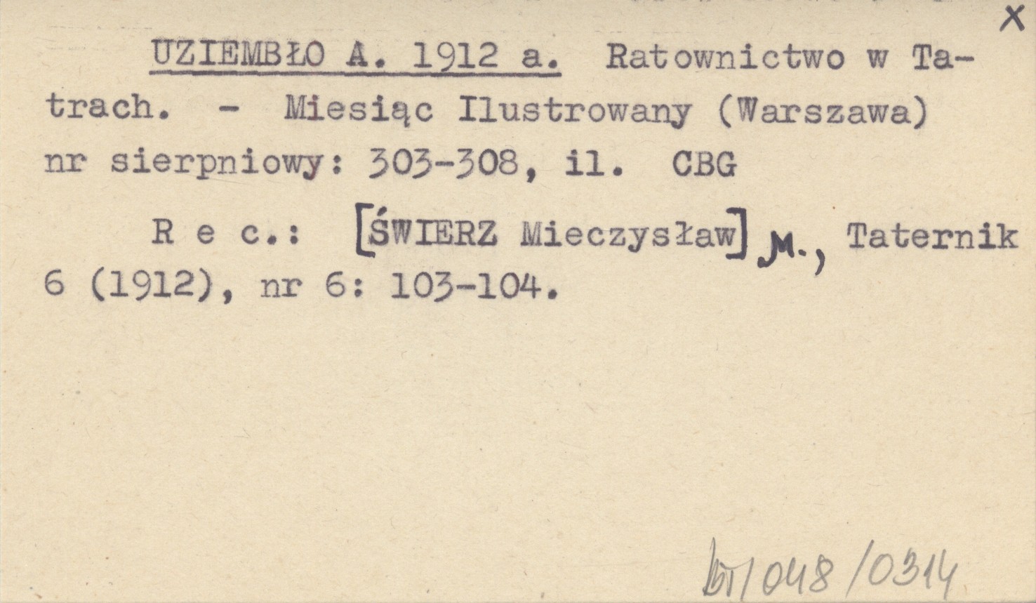 Miesiąc Ilustrowany (Warszawa) , VIII 1912: 303-308, il. REC: [ŚWIERZ Mieczysław] M., Taternik 6 (1912), nr 6: 103-104.